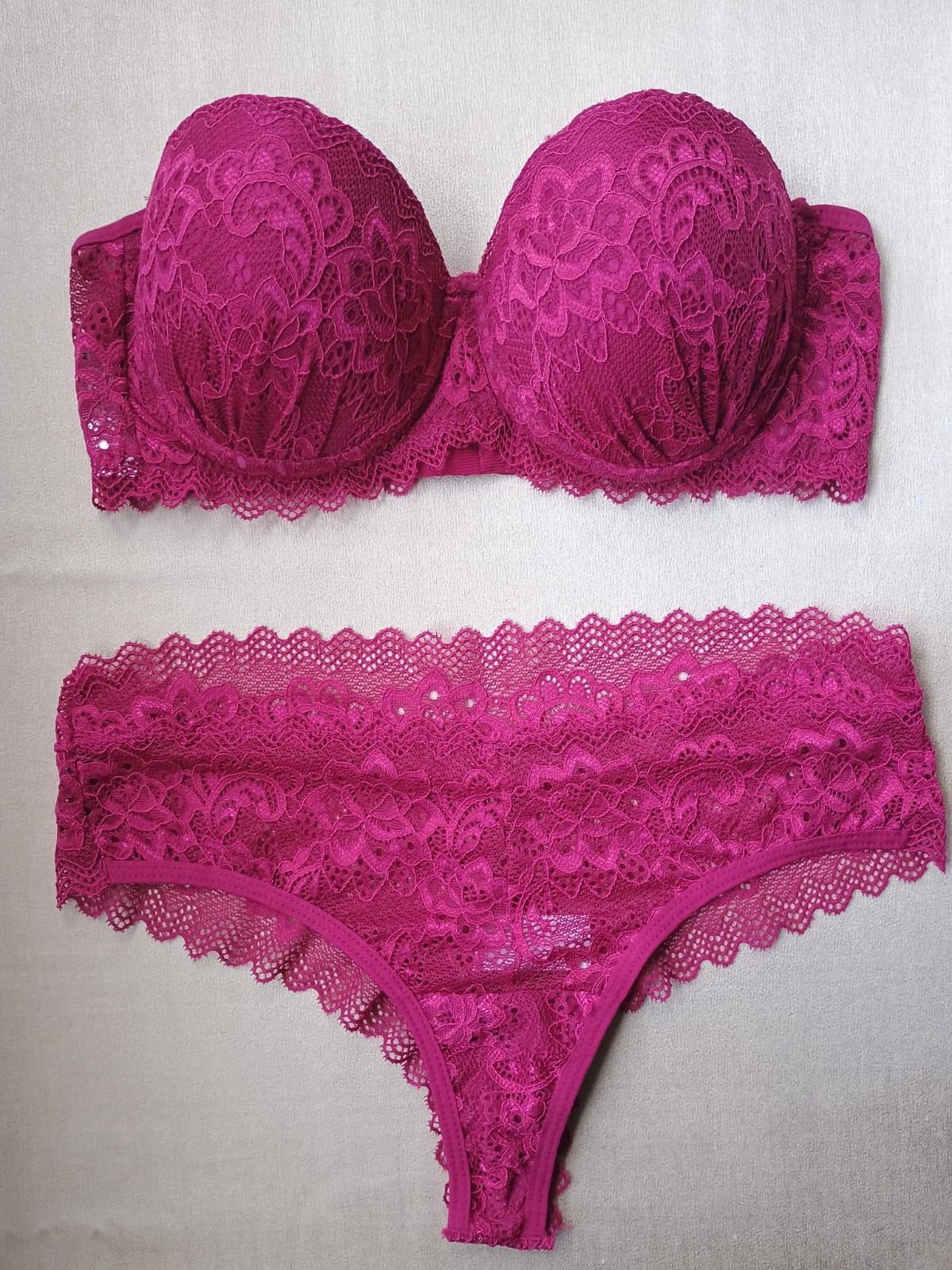 Conjunto de sutiã meia taça em poliamida e renda na cor vinho. Sutiã com bojo e aro de armação, com bolha de enchimento nos tamanhos P e M e sem bolha de enchimento nos tamanhos G e GG. Fecho do sutiã com 3 ganchos e 3 níveis de ajuste. Sem opção de uso com alças. Produto bem estruturado, renda macia e confortável.