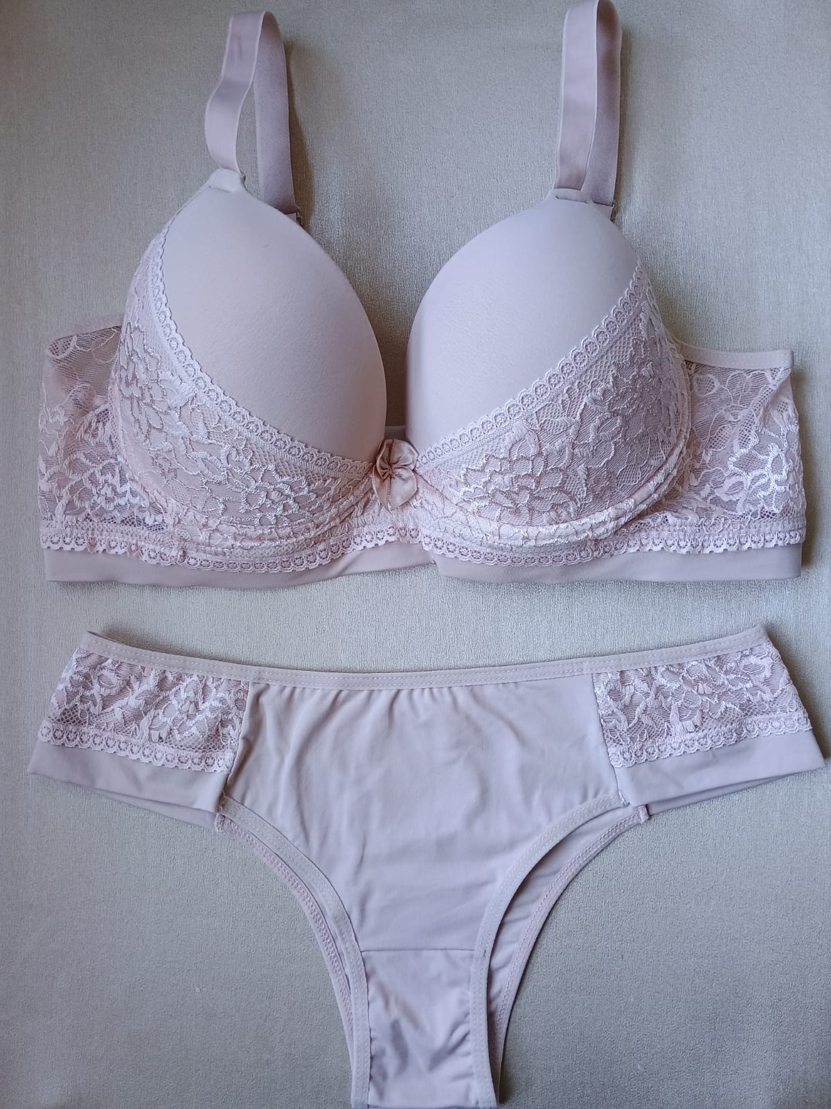 Conjunto de sutiã e calcinha em poliamida bege com detalhes em renda na cor bege. Sutiã com bojo e aro de armação. Fecho do sutiã com 3 ganchos e 3 níveis de regulagem. Sutiã com base em elástico reforçado, proporcionando conforto e sustentação. Renda de excelente qualidade.