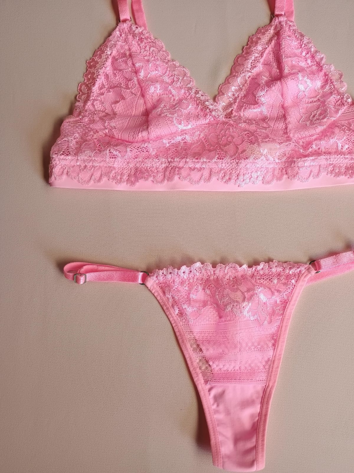 Conjunto de sutiã e calcinha em poliamida e renda na cor rosa. Sutiã sem bojo e sem aro de armação, com forro. Fecho do sutiã com 3 ganchos e 3 níveis de regulagem, proporcionando conforto e maior sustentação. Renda de excelente qualidade, macia ao toque.