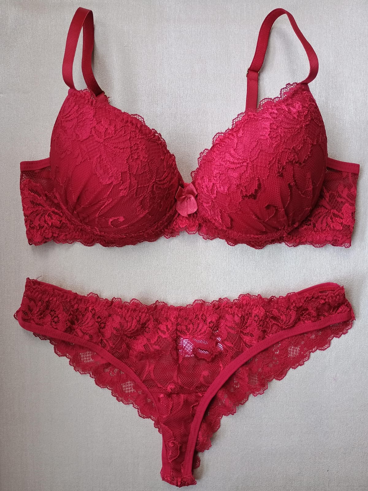 Conjunto de sutiã e calcinha em poliamida e renda na cor vermelha. Sutiã com bojo e aro de armação, com bolha de enchimento nos tamanhos P e M e sem bolha de enchimento nos tamanhos G e GG. Fecho do sutiã com 2 ganchos e 3 níveis de regulagem. Renda de excelente qualidade, macia ao toque.